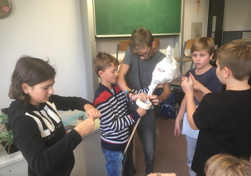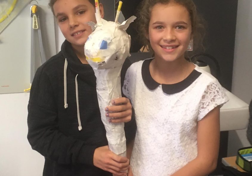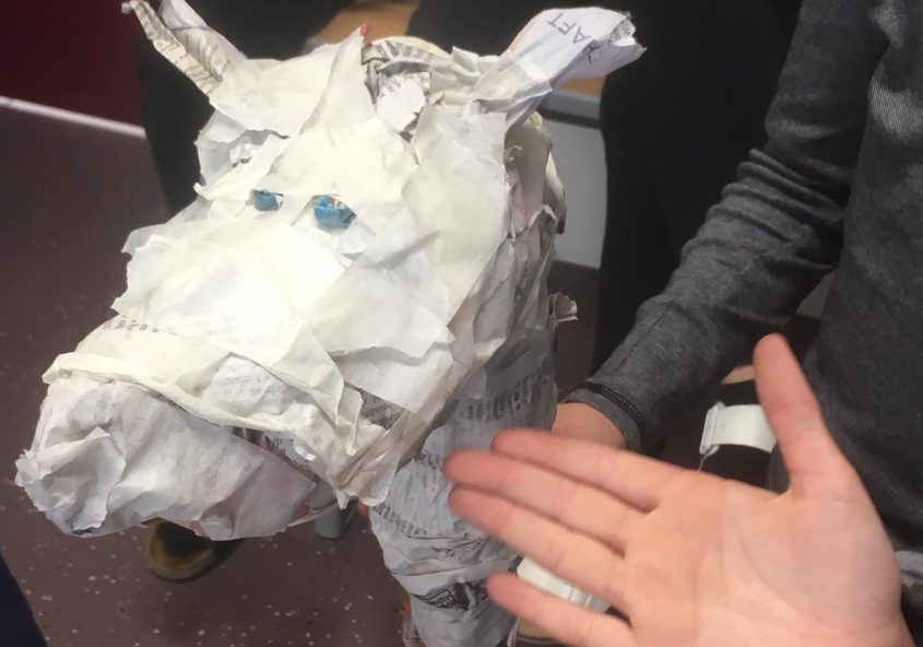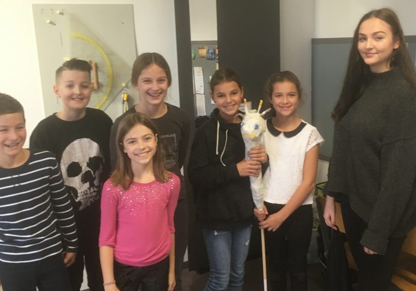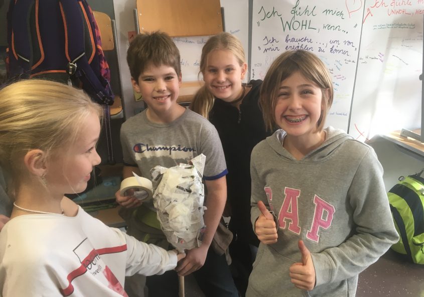 In unserer SoKo-Stunde mit den Buddys befanden wir, 1D-Klasse, uns heute in einer Kreativwerkstatt, in der wir mit Holzstäben, Tesakrepp und einer Menge Zeitungspapier unsere Klassenmaskottchen gebastelt haben. Vier Gruppen arbeiteten mit ihren Buddys an Giraffen- und Wolfsfiguren. Die Tiere waren sorgsam gewählt. In Anlehnung an den bekannten Konfliktmediator Dr. Marshall Rosenberg sind Giraffen das…