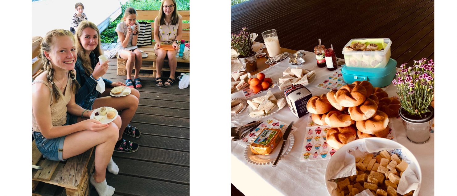 Bei selbst gebackenen SCONES und SHORTBREAD, SANDWICHES und ENGLISH TEA genossen die Schülerinnen und Schüler eine lustige und entspannte Stunde am schönen Schulteich, ein wohlverdienter Abschluss eines fordernden Schuljahres!