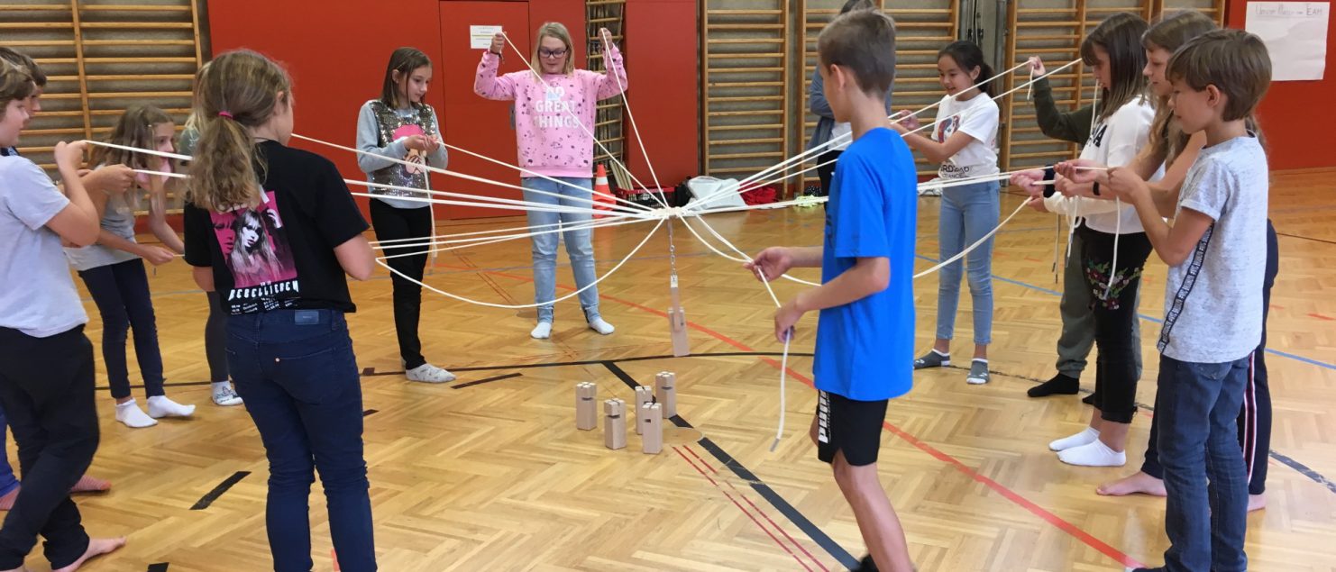 Die sechs 1. Klassen starteten in das neue Schuljahr mit einem erlebnispädagogischen Tag. Unter Anleitung unserer Erlebnispädagoginnen wurden einen Vormittag lang Berge versetzt, Türme gebaut, Kugelbahnen verlegt, Mutläufe absolviert und Schafe gehütet. Ziel des Programms war es, die neue Klassengemeinschaft der 1. Klassen zu erleben und zu stärken, was rundum gelungen ist.