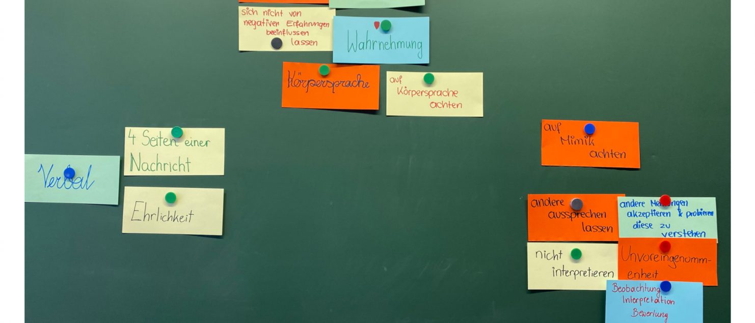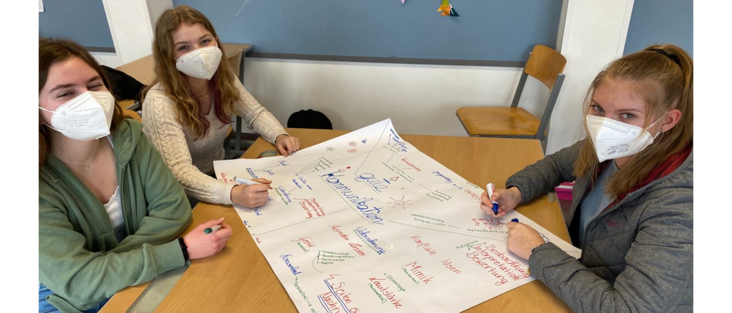 Unsere Schüler*innen beschäftigten sich mit diesen Themen nicht nur auf theoretischer Ebene, in dem sie sich Gedanken zu nonverbaler Kommunikation und Kommunikation insgesamt machten, sondern sie übten sich auch selbst in ihren Gesprächsrollen.