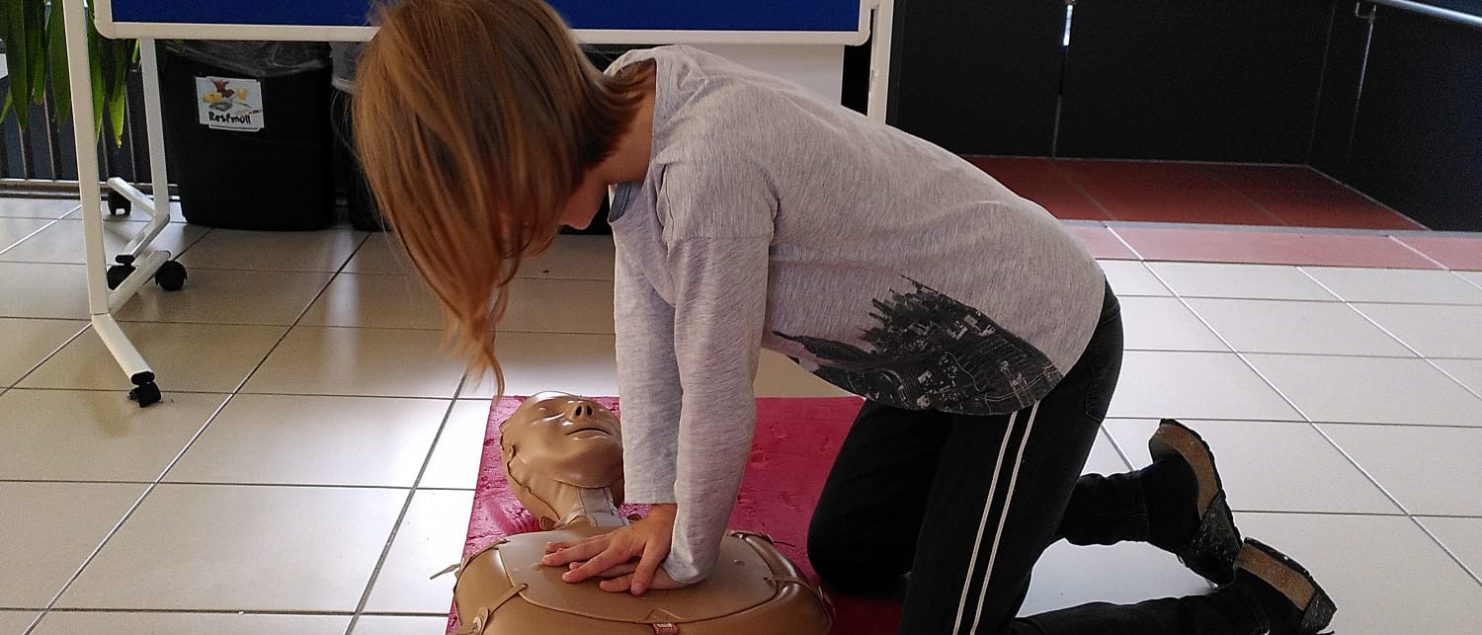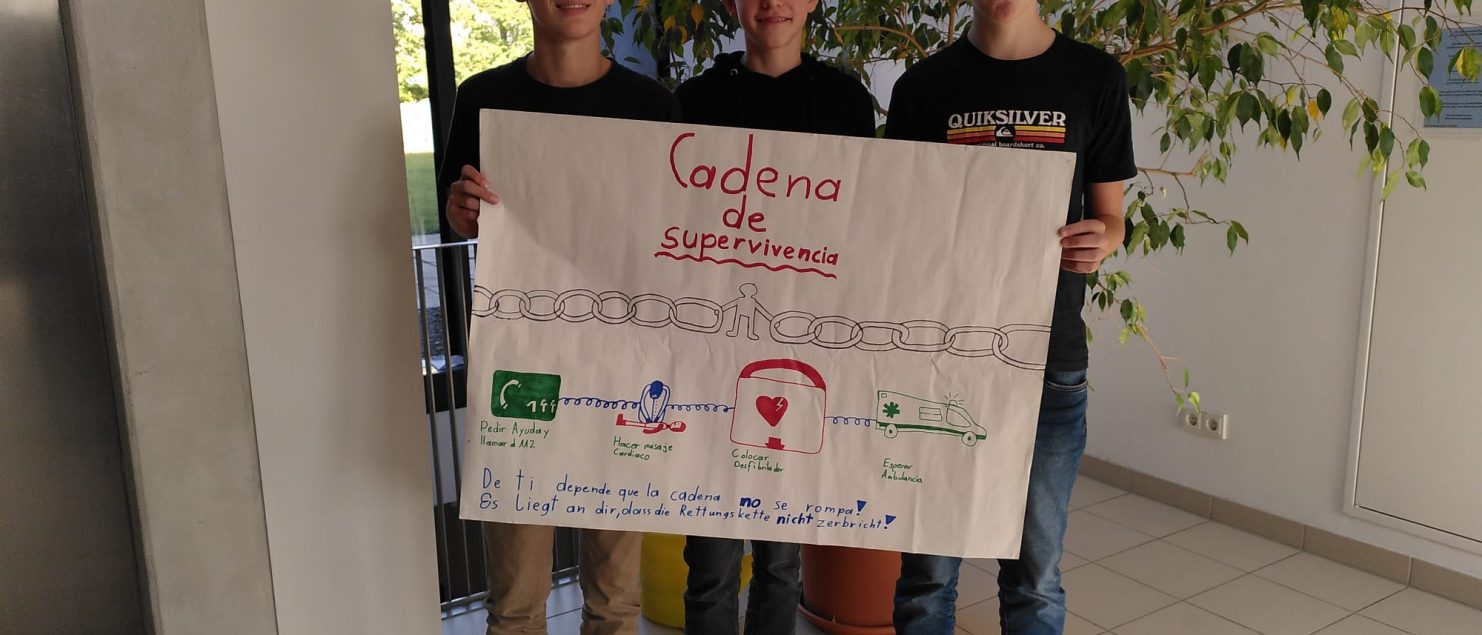 Nach coronabedingter Pause war es heuer wieder möglich, den Internationalen Tag der Wiederbelebung am 16.10. zum Anlass zu nehmen, um auch unseren Schülerinnen und Schülern die Handgriffe der Herzdruckmassage in Erinnerung zu rufen. Unter Anleitung und im Rhythmus von dem Song „Staying alive“ nutzten mehr als 50 Personen die Gelegenheit, in der großen Pause das Reanimieren zu üben. Besonders fleißig war die 4CF, die zu diesem Thema auch Plakate auf Spanisch gestaltete und so den gerade im Unterricht gelernten Imperativ praktisch anwenden konnte. ¡Haz el masaje cardiaco y salva vidas!