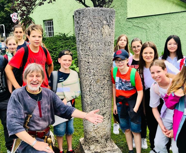 Nach einem sehr interessanten Rundgang auf dem „Römerweg Ovilava“ brachte der Hobby-Historiker Hubert Krexhammer (angezogen wie ein Römer) den Schülern viele wissenswerte Details aus dem Bereich der Archäologie, der Geschichte und des Alltags nahe.